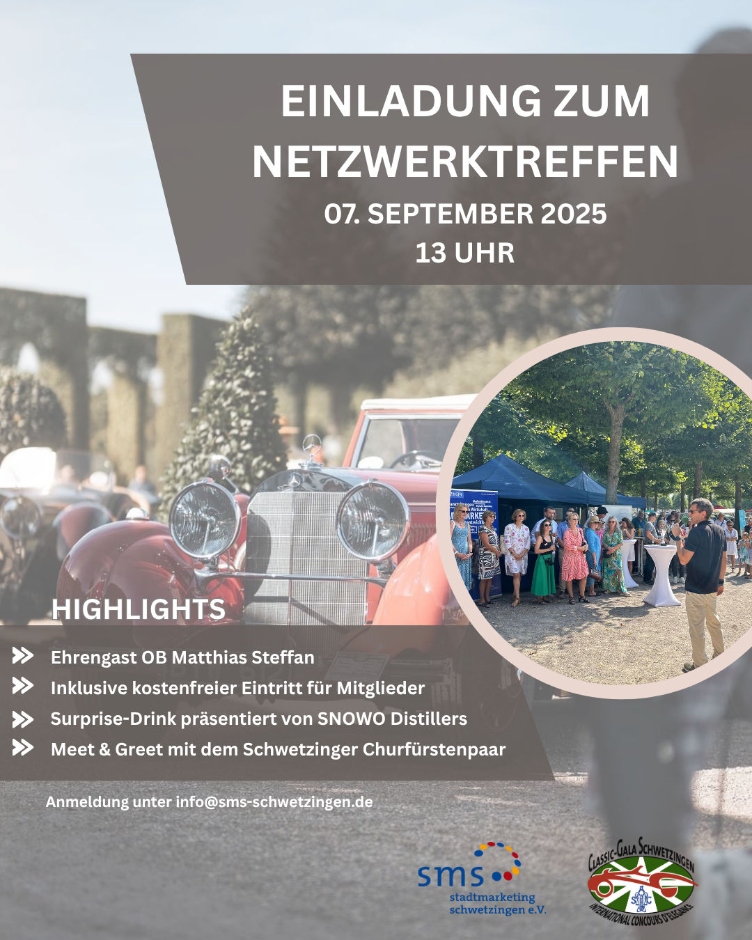 Auch 2025 lädt das Stadtmarketing Schwetzingen wieder alle Mitglieder herzlich zum Netzwerktreffen im Rahmen der Classic-Gala ein. Treffpunkt ist am Sonntag, den 07. September um 13 Uhr am Stand des Stadtmarketing im Schlossgarten.